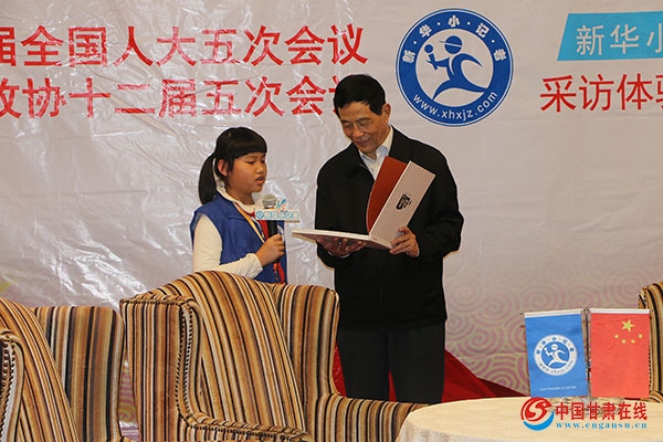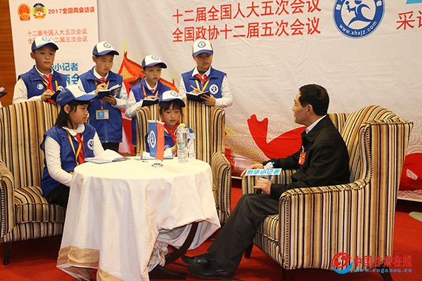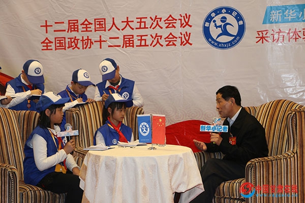 图为:全国政协委员王广谦接受甘肃平凉新华小记者王涵、白震宇采访