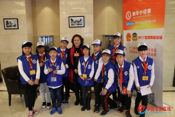 图为:甘肃平凉及全国两会新华小记者与全国政协委员苏燕玲合影