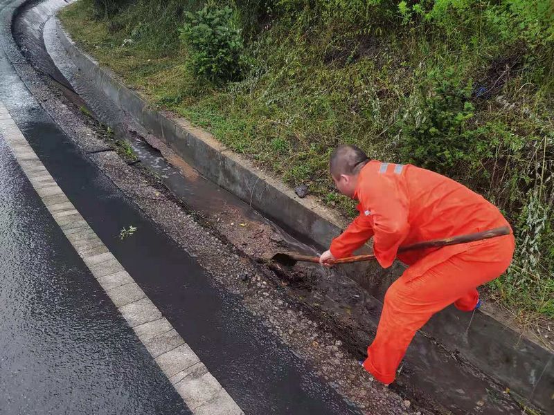 一是紧急安排人员、机械对路边碎石、落叶、边沟杂物、淤泥及堵塞涵洞及时进行清理,确保公路及沿线设施排水畅通。二是由值班领导带领专业技术人员和机械赶赴各管养路段进行上路巡查,重点针对临水临崖路段、高边坡、长大陡坡、易落石路段的安全畅通进行拉网式排查,仔细查看山体滑坡情况,排查险情。三是加大应急值班力度,及时做好信息报送和调度,确保第一时间收到路上突发紧急情况的反馈。四是按照应急预案,全面落实各项防汛要求,保障各类防汛机械、物资、人员及时到位,能够有效应对突发状况。五是要求所有一线上路作业人员严格按照安全规范进行养护,做好自身安全防护工作确保职工自身安全。