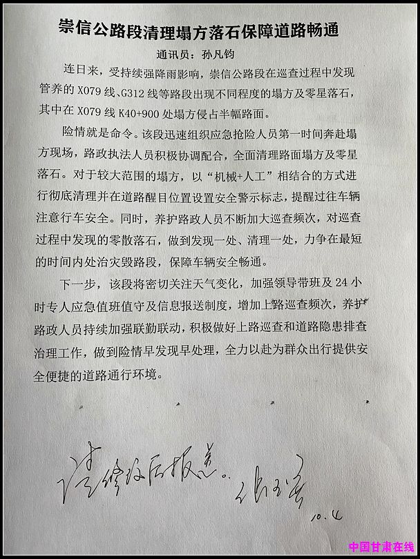 中国甘肃在线崇信讯(通讯员:孙凡钧)国庆假期,受持续强降雨影响,崇信公路段在巡查过程中发现管养的X079线、G312线等路段出现不同程度的塌方及零星落石,其中在X079线K40+900处塌方侵占半幅路面。