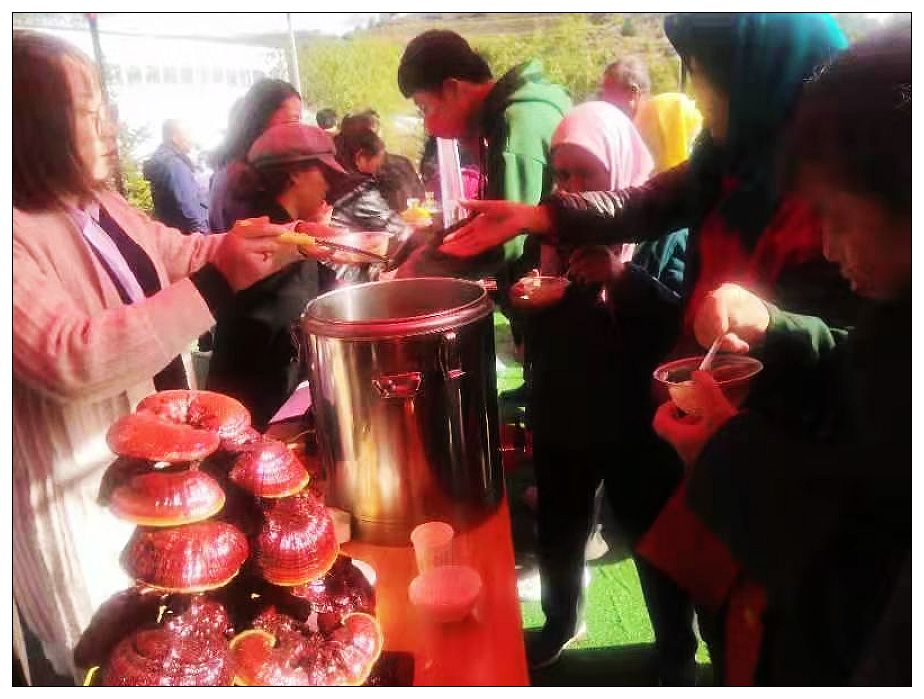 高义小学三年级的学生王书涵用手指摸了摸展台上红黄色的灵芝,好奇地问:“这要怎么吃呢?”负责讲解的工作人员耐心的给小朋友科普了灵芝功效与食用方法;另一边,65岁的东庄村村民姚风奇正在品鉴用灵芝炮制的黄酒,一杯下肚,他砸了咂嘴竖起了大拇指,说到:“这酒口感很好,特别绵柔,来大伙都尝一杯。”而香气扑鼻的灵芝炖肉,更是赢得了父老乡亲的喜欢,点赞声络绎不绝。