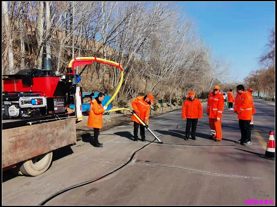 中国甘肃在线崇信讯 初春乍暖。平凉市崇信公路段抢抓春季公路路面养护的有利时机,扎实推动“职能归位、职责落地”工作落地见效,组织专业养护队对S203线路面裂缝进行灌缝作业。