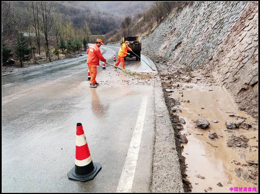 再看另一个小分队华亭养管站这边,养路工们披着雨衣一片忙碌。有的在桥上清理积水,疏通泄水孔,有的在清理塌方,有的在清扫路面抛洒物,有的在全线巡查公路(配图4)......