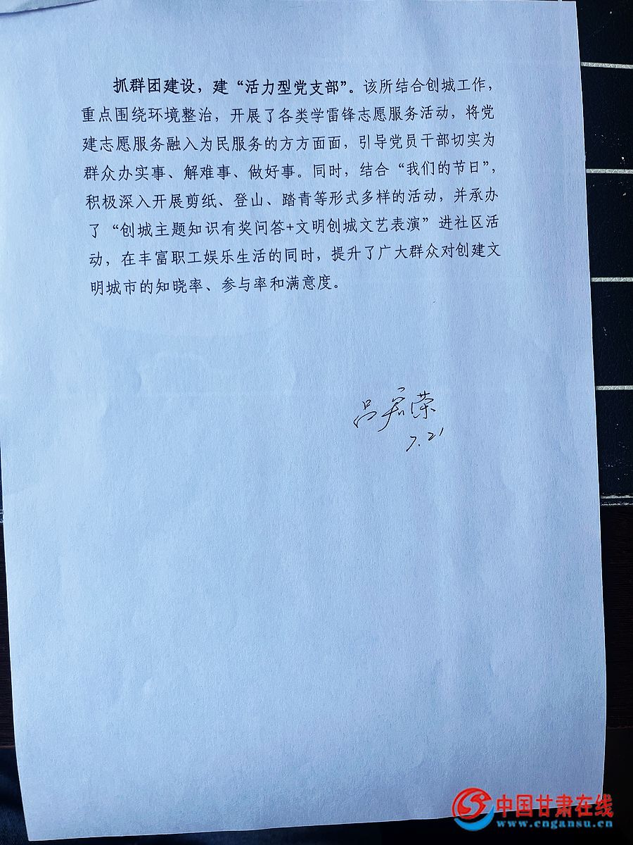抓群团建设,建“活力型党支部”。结合创城工作,围绕人环境整治重点工作,开展各类学雷锋志愿服务活动,将党建志愿服务元素逐渐融入为民服务的方方面面,引导党员干部切实为群众办实事、解难事、做好事。结合“我们的节日”,深入开展剪纸、登山、踏青等形式多样的活动,承办了“创城主题知识有奖问答+文明创城文艺表演”进社区活动,提升了广大群众对创建文明城市的知晓率、参与率和满意度。