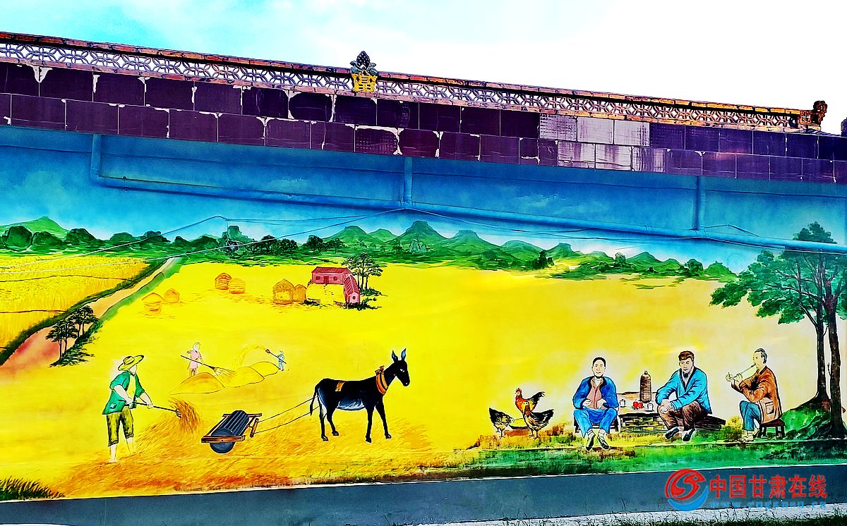 同样在新窑镇戚家川村,色彩斑斓、别具一格的文化墙也随处可见,为大家的生活增添了不少乐趣。抬头蓝天白云,低头满目金黄,麦浪滚滚,分布有序的田地,风中摇晃的稻草人,与农民收割麦子的繁忙景象相映成趣。