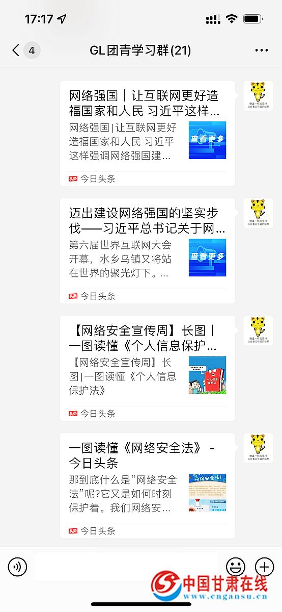 组织团员青年通过“线上+线下”模式深入学习宣传贯彻习近平总书记关于网络强国的重要思想及《中华人民共和国网络安全法》、《个人信息保护法》等网络安全知识,观看了《安全在您身边》短片,以实例为鉴开展警示教育,积极倡议广大团员青年坚守法律底线,做网络法制的建设者;强化安全意识,做网络安全的维护者;崇尚社会公德,做网络文明的推动者;唱响安全上网主旋律,做网络正能量的传播者。