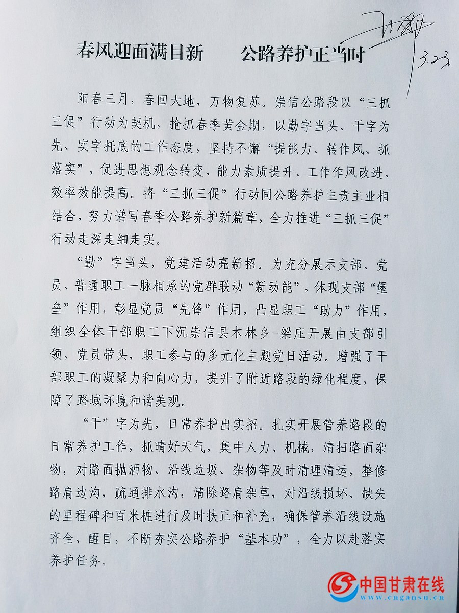 中国甘肃在线崇信讯 阳春三月,春回大地,万物复苏。平凉市崇信公路段以“三抓三促”行动为契机,抢抓春季黄金期,以勤字当头、干字为先、实字托底的工作态度,坚持不懈“提能力、转作风、抓落实”,促进思想观念转变、能力素质提升、工作作风改进、效率效能提高。将“三抓三促”行动同公路养护主责主业相结合,努力谱写春季公路养护新篇章,全力推进“三抓三促”行动走深走细走实。