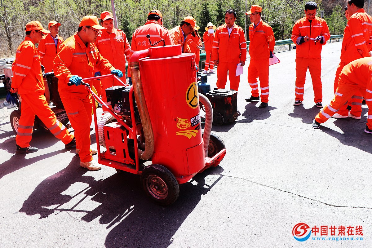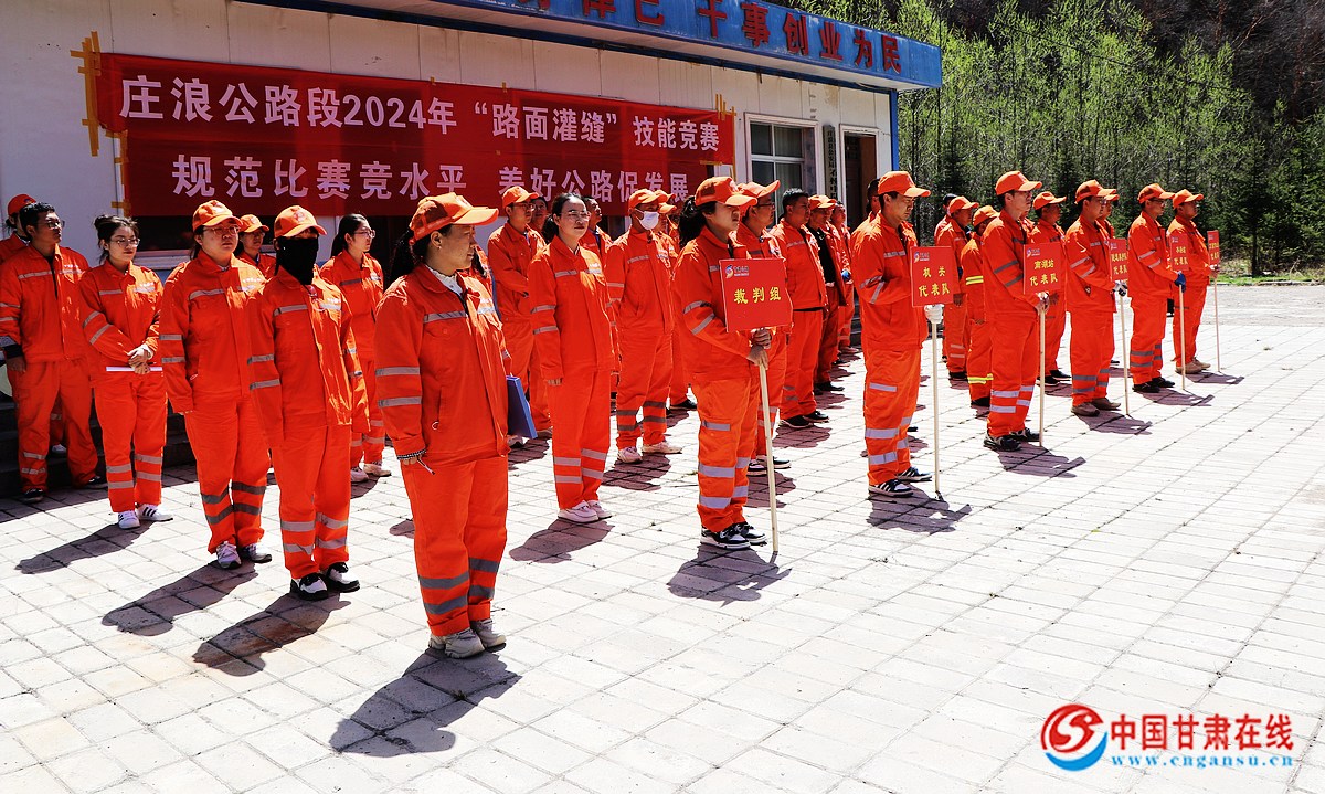 在S304线关山路段,安全布设规范醒目,布设区内灌缝机、开槽机等设备整齐排列,由养护技术室主任带领的作业示范队成员整齐有序等待比武号令……这正是庄浪公路段为了进一步提高养护水平、锻炼职工队伍,在这里开展的路面灌缝技能竞赛活动现场。