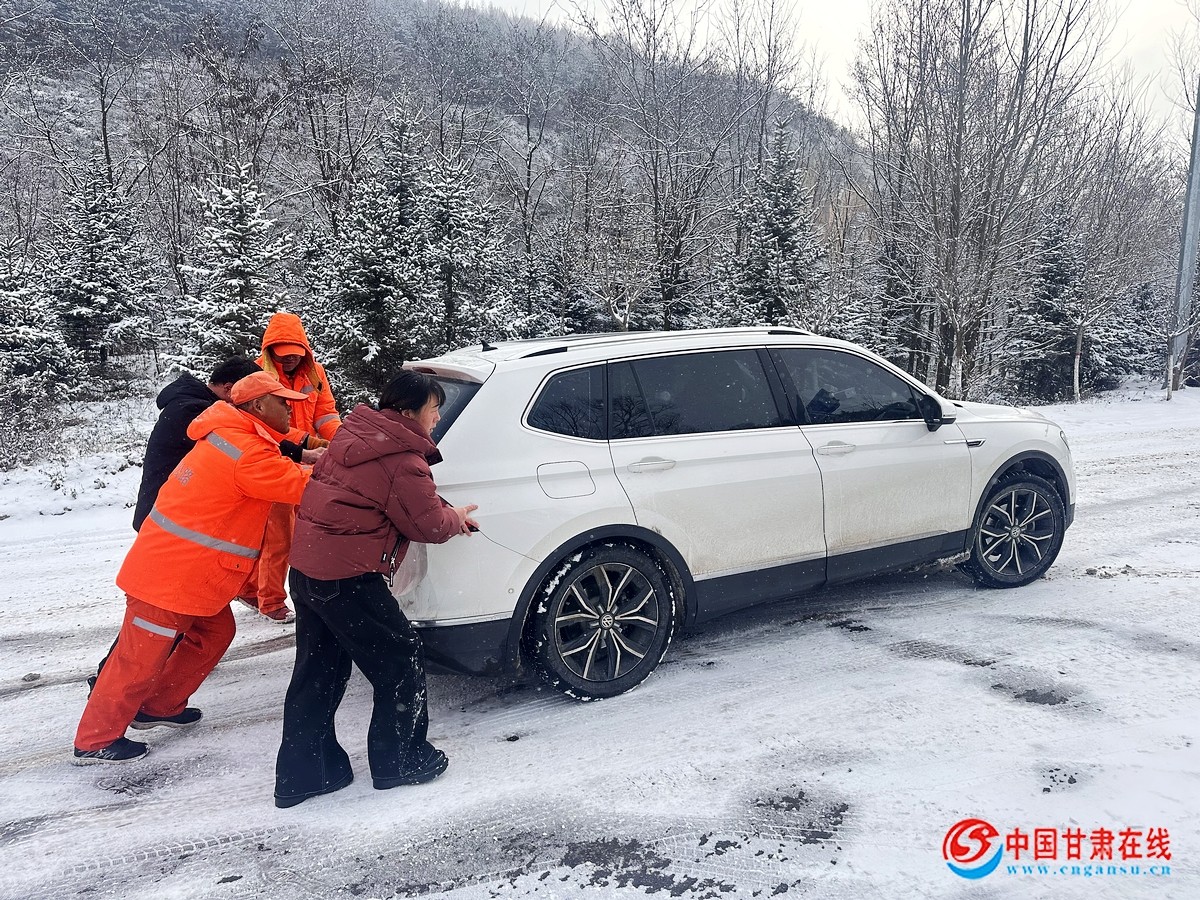 中国甘肃在线华亭讯 12月8日至12月10日,受新一轮强冷空气影响,华亭境内普降小雪,为最大限度减少交通拥堵,保障人民群众安全出行,确保辖区各路段安全畅通,12月9日早上,华亭公路段及时组织人员、机械开展除雪防滑保畅工作,在行驶到S304线关山段时,该段上路人员发现在陡坡路段有一辆车出现打滑被困的情况,便立即下车提供帮助。“师傅,别着急,我们帮你往上推推”,在推车过程中车辆依然打滑无法移动,该段人员随即便在车轮前方用铁锹撒布防滑料。就这样,一名人员在车前方撒布防滑料,两名人员在车后推车,随着众人力量的汇聚,汽车车轮缓缓向前,最终到达坡顶离开被困区域。“谢谢,谢谢你们的帮助,我女儿早上生了孩子,我们往医院赶,结果在这打滑上不去了,今天幸亏有你们的帮助。”坐在副驾的大姐激动的说着。
