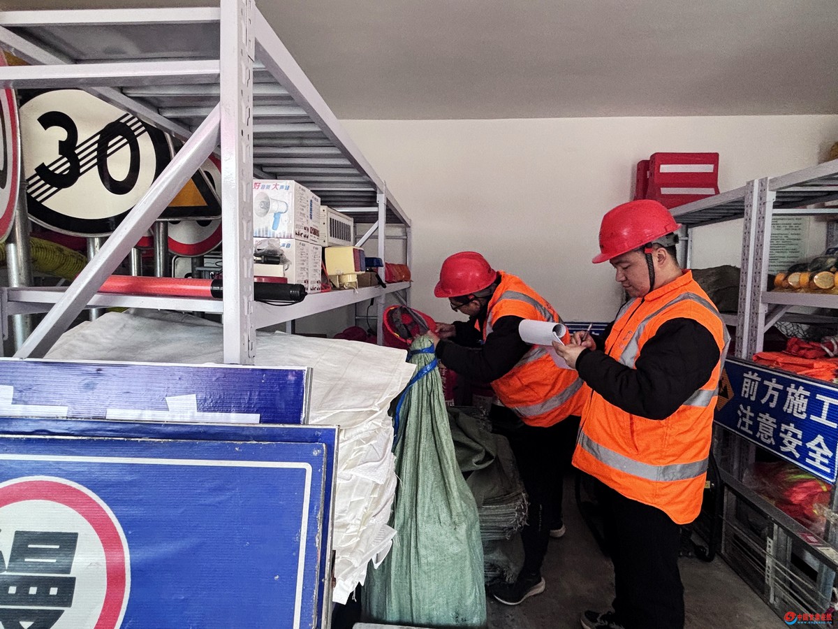 检查中,检查人员对临水临崖路段、急弯陡坡路段进行逐一排查梳理;对办公区域电路、用水设施进行全面检查;核查应急养护物资储备情况,确认融雪剂、防滑料、铁锹等工具均储备充足、摆放规范,可随时响应调用需求,为春节期间公路应急处置提供坚实保障。