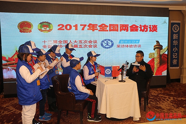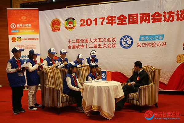 图为:全国政协十二届五次会议开幕  3月4日下午,来自一百多名全国各地的新华小记者分组采访了8位全国政协委员,甘肃平凉市崆峒实验小学的王涵代表甘肃分组在首都北京以平凉新华小记者的名义,面对面采访了第十二届