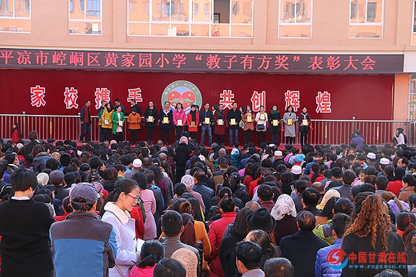 图为:平凉崆峒区黄家园小学举行“教子有方”奖表彰大会现场  中国甘肃在线讯 11月1日讯(记者:马来虎) 10月31日,崆峒区黄家园小学举行了“教子有方奖”表彰大会。表彰了该校教子有方的优秀家长和优秀教职工,该