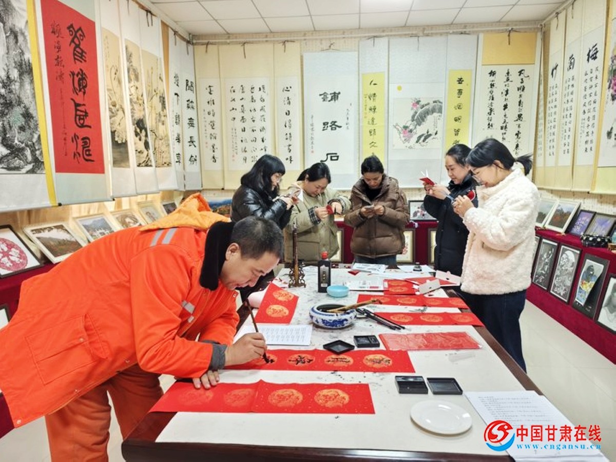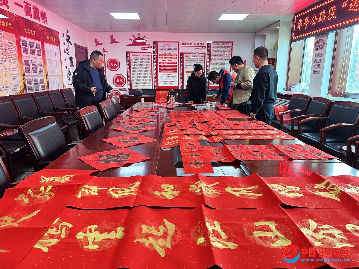 中国甘肃在线华亭讯 在新春佳节来临之际,华亭公路段开展“泼墨写春联,送福进万家”活动,特邀书法爱好者用笔墨丹青为职工送上一份特殊的新春“年货”。活动现场,长桌整齐排列,红色宣纸铺就一片喜庆。书法爱好者时而低头调墨、时而凝神构思,笔走龙蛇间尽