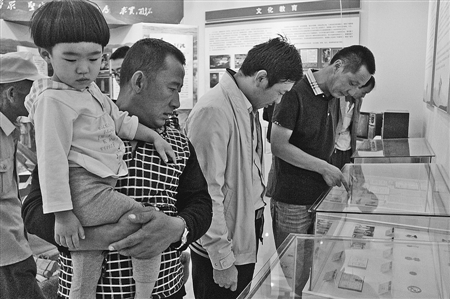 9月18日,华池县南梁镇荔园堡村村民在参观村史馆。