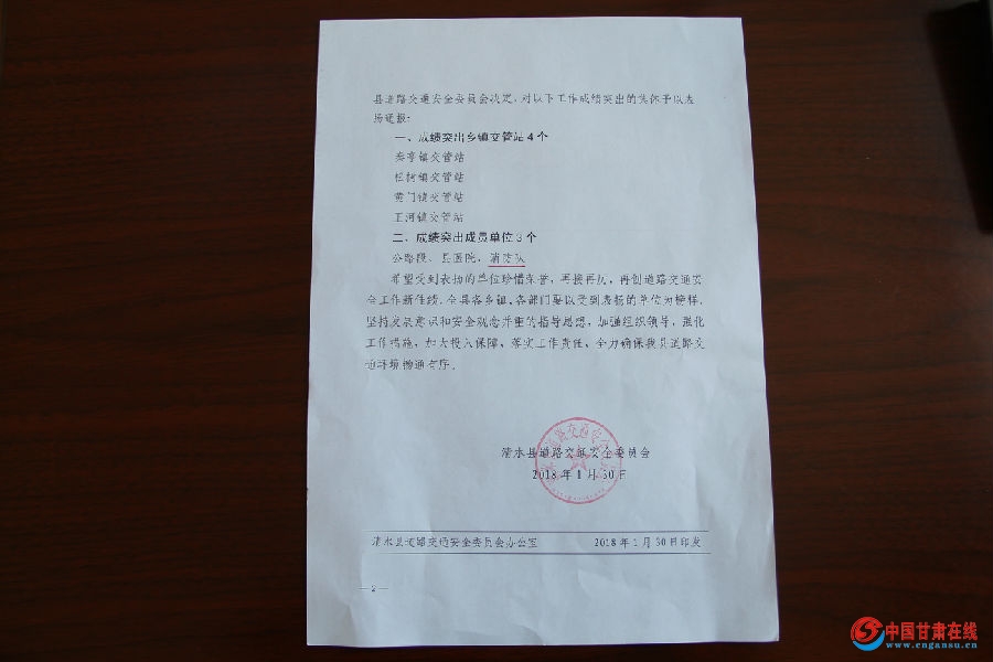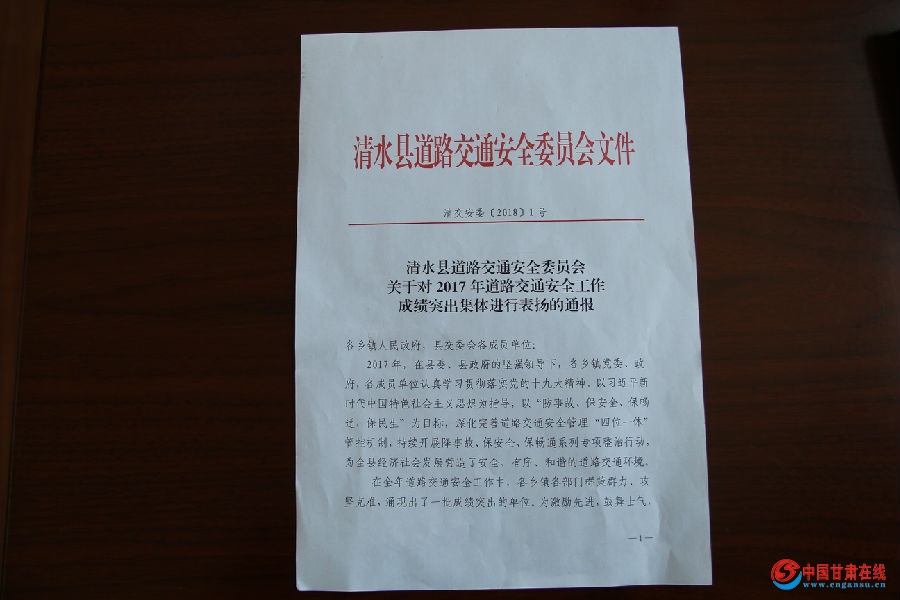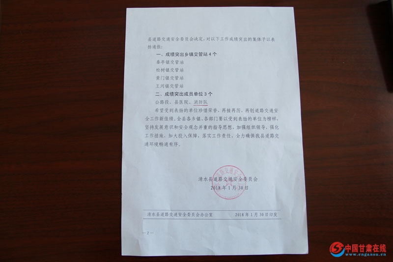 2月5日,清水消防大队被清水县道路交通安全委员会评为2017年度“道路交通安全工作先进集体”,这一殊荣,是清水县道路交通安全委员会对大队2017年以来完成各项任务的褒奖,也充分肯定了大队为清水县道路交通安全工作作出的贡献。
