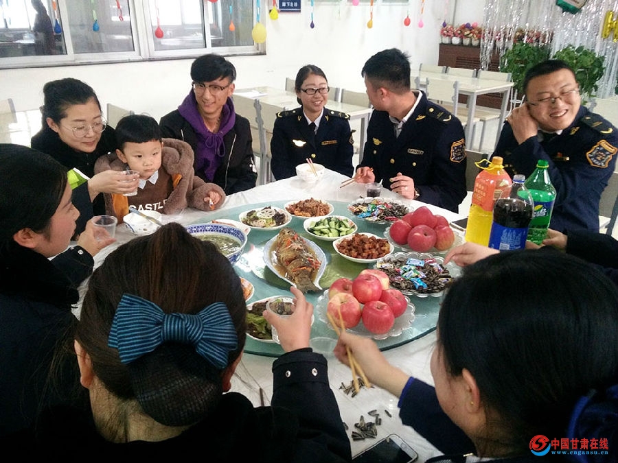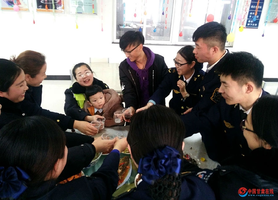 今天的餐桌也因为有了阿诺而更加的热闹,小朋友开心的为大家唱起了《新年好》,大家伸出手也帮着阿诺打起了节拍,大家笑着唱着,眼中泛起了点点泪光,“虽然又一次不能回到亲人身边,和家人一起吃团圆饭,但是,在天水西收费站这个大家庭,彼此就是亲人,就是兄弟,就是姐妹,一起团团圆圆,干杯”。班长坚文静的一席话顿时说到了大家心坎里。