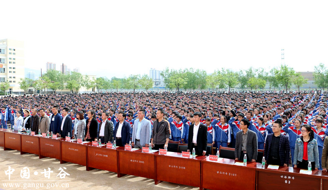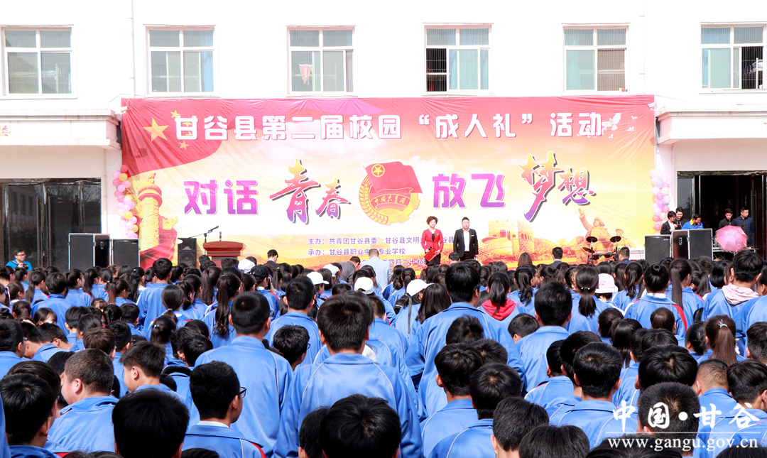 4月27日,由共青团甘谷县委、县文明办、县教体局主办的第二届校园成人礼“对话青春 放飞梦想”活动在甘谷县职业中等专业学校举行。县委常委、组织部长冯建新,县文明办、团县委、县关工委、县直属中学团委等负责人出席活动;县直属中学学生代表、家长代表、甘谷职专一、二年级全体师生参加活动。