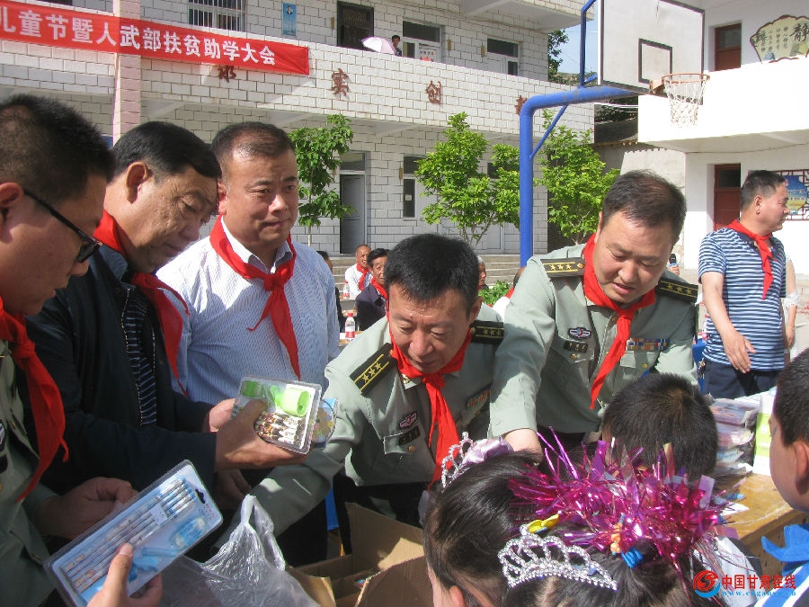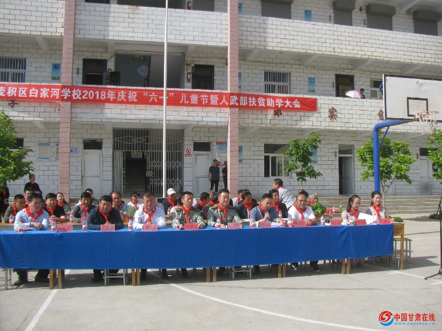 5月31日上午,麦积区人武部部长鲁国玺、政委钟慧杰带领干部职工深入花牛镇白家河学校,在庆祝“六一”儿童节之际,为全校123名学生赠送书包、学习用品及节日的祝福,受到师生们的热烈欢迎。活动现场学校为新入队儿童举行了入队仪式并佩戴上了崭新的红领巾,表彰了优秀辅导员和优秀学生,全校师生及周边幼儿园表演了舞蹈《追梦》、《感恩有你》等20多个精彩的文艺节目。