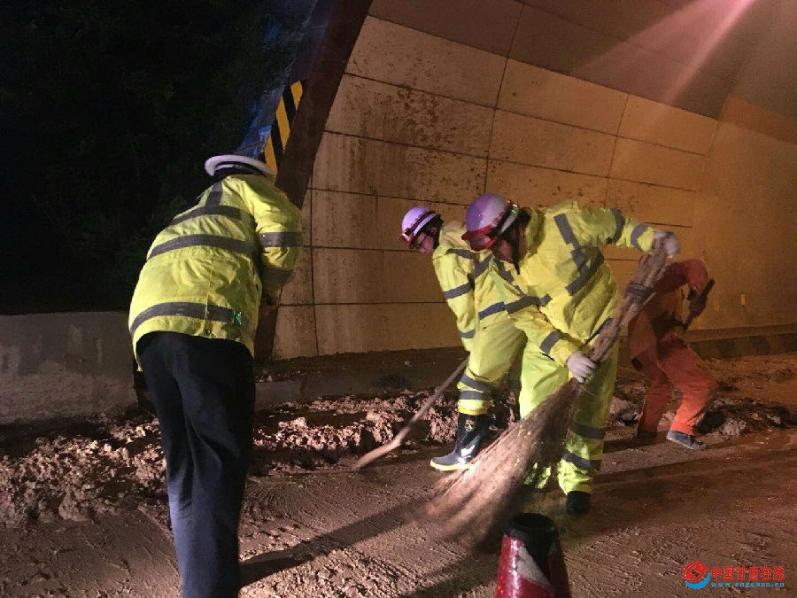 22:30分接甘谷分中心来电,天水往兰州方向大像山隧道口出现泥石流,大雨仍在瓢泼,能见度很低,情况十分紧急!一大队甘谷中队立即出动赶往现场处置。到现场后发现泥石流经隧道口已经流入隧道内,对来往车辆造成十分大的隐患。交警暂时封闭道路,一中队人员立即做好现场防护,与交警、养护人员将泥石流清理。经过一个小时紧急处置,将淤泥全部清理出隧道,道路恢复畅通。天水清障救援一大队 金利娟