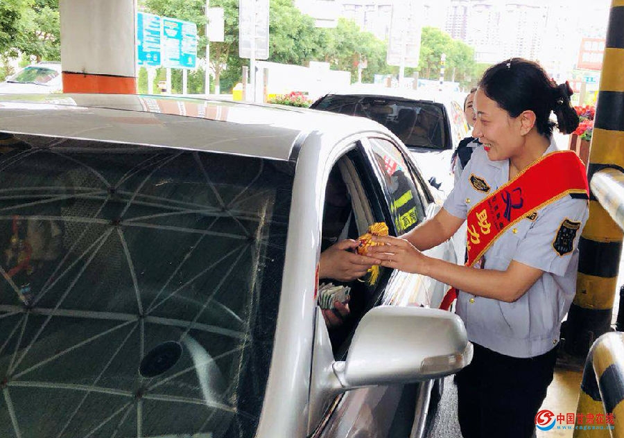 6月18日,时值端午佳节,宝天高速公路收费管理所工作人员为过往司乘人员发放绣有“微笑宝天”字样的香包。小小的礼物,浓浓的祝福,让过往的司乘人员赞不绝口。