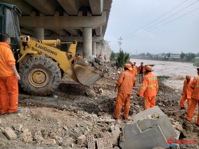 截止7月3日20时,武山县洛门境内小雨,天水公路管理局高养中心洛门大桥抢险工作还在冒雨持续进行。通讯员:天水公路管理局高养中心 胡泽庭