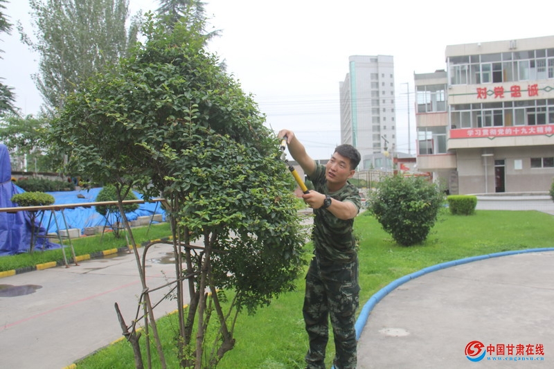 为进一步美化环境,提升警营绿化质量,营造栓心留人的和谐环境,推动部队正规化建设和基础设施建设,。7月16日上午,天水郡中队组织官兵对营区绿化、树木进行修剪。