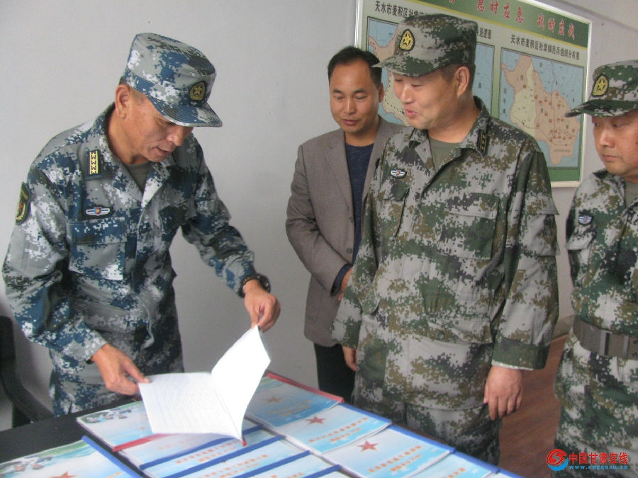 作9月18日,天水军分区司令员刘甫清带领工作组一行赴麦积区检查调研基层武装工作。市政协副主席、区委书记张智明,区委副书记、区长成少平,区人武部部长鲁国玺、政委钟慧杰陪同调研。