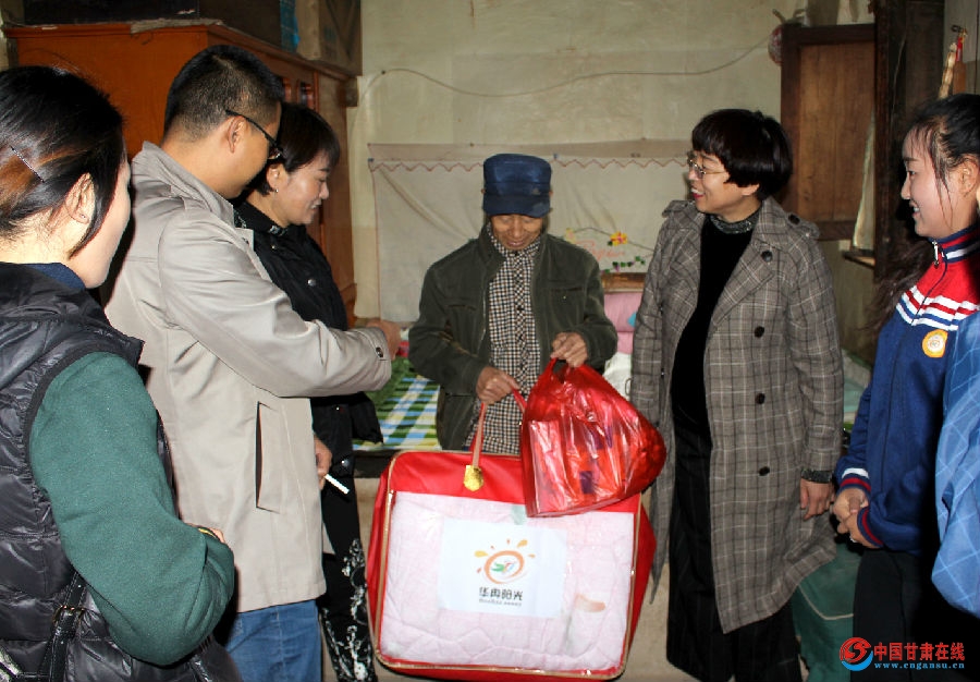 10月18日,麦积区妇联牵手阳光幼教•爱心火炬公益团队走进琥珀镇高方村,为该村6户五保户和困难老人分别送去了棉被、电热水壶、暖水袋等过冬慰问品,一声问候,几句细语,给老人们带去了亲人般的问候和春天般的温暖。