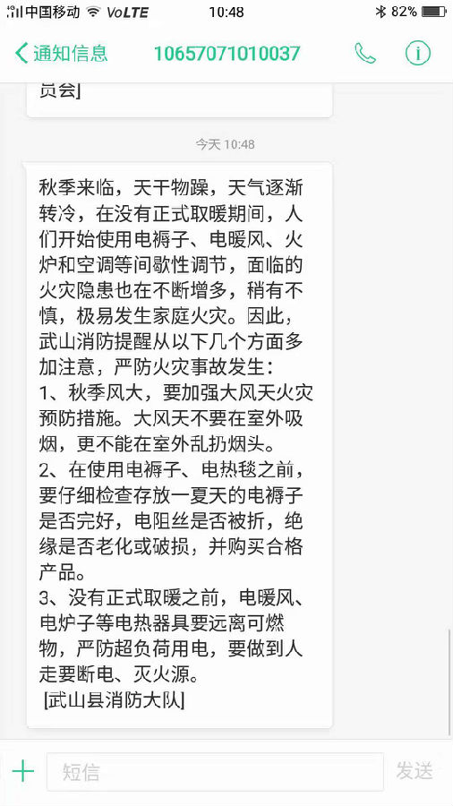 为切实做好秋季消防安全工作,武山消防大队借助短信平台的网络优势,向手机用户免费发送防火宣传信息,提醒群众加强秋季用火、用电管理。