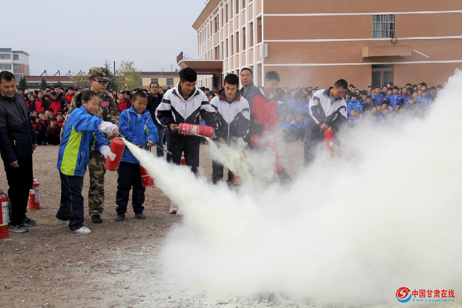 上午10时许,随着一阵急促的预警铃声响起,演练正式拉开序幕。武山县第四中学所有师生听到警铃后,在老师和学校管理人员的组织下,2500余名师生猫腰捂鼻按消防人员划定的逃生路线,分别从教学楼的两个疏散楼梯迅速的撤离,3分钟撤离完毕到达操场安全位置。随后,大队培训人员结合当前消防安全工作的特点,为全体师生着重讲解了学校消防安全知识,并且根据当前火灾特点,讲解了安全用火用电常识,火灾的预防措施以及常见火灾的处置方法等,并结合实际,对如何正确使用灭火器进行了较为详尽的说明,并实地演示灭火器的使用。