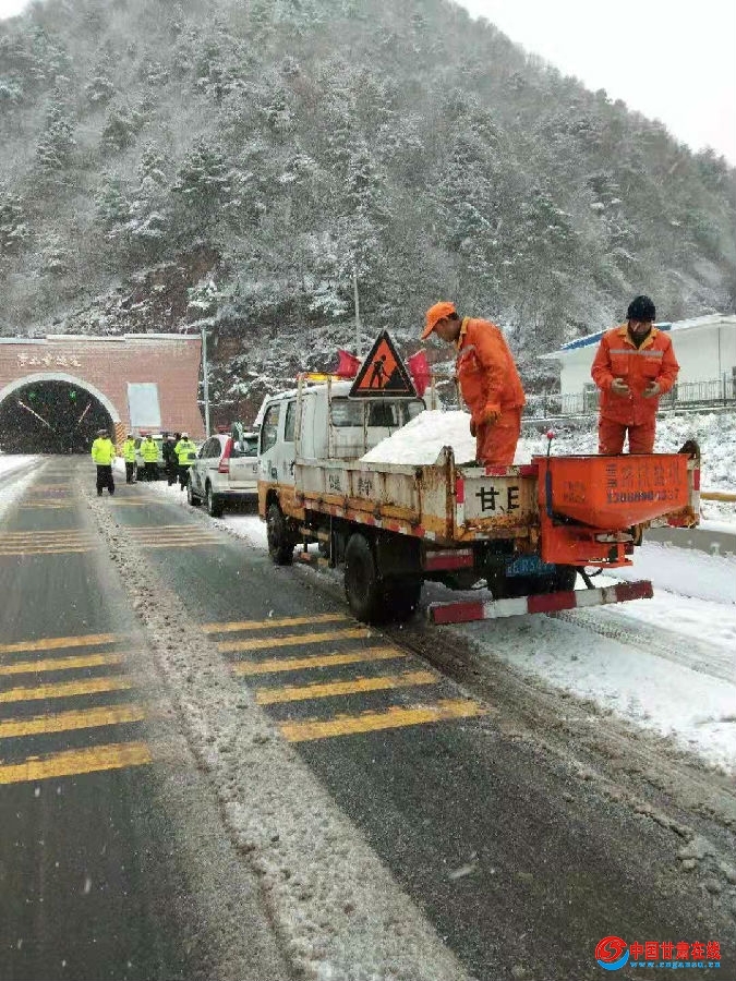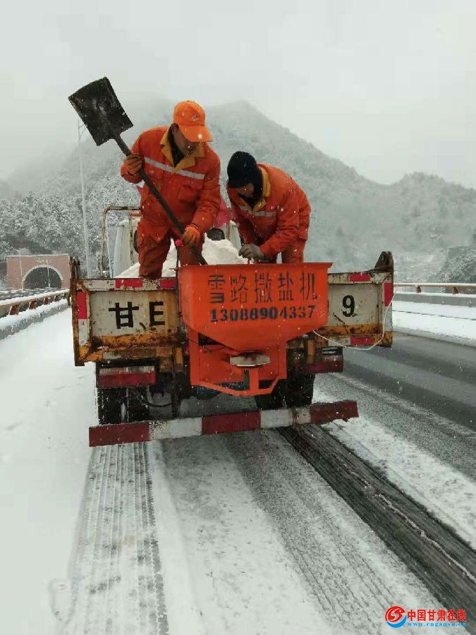 甘肃天水公路管理局高养中心以雪为令,启动防滑保畅应急预案,昼夜奋战,采取有效措施投入到除雪防滑保畅的攻坚战中。夜间在长大下坡和易结冰路段撒铺融雪剂,白天多功能除雪车全线撒铺融雪剂推雪,人工配合小型融雪剂撒布机在急弯长坡、桥面、隧道进出口等重点路段撒铺融雪剂和防滑料,全面打冰除雪。