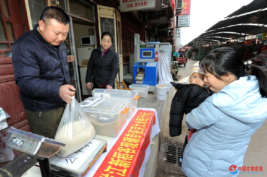 11月21日,麦积区桥南仿古街店主李天龙正在现磨大米。这是来自黑龙江的优质带壳稻谷,经过现场脱壳碾磨、销售,深受消费者的青睐。