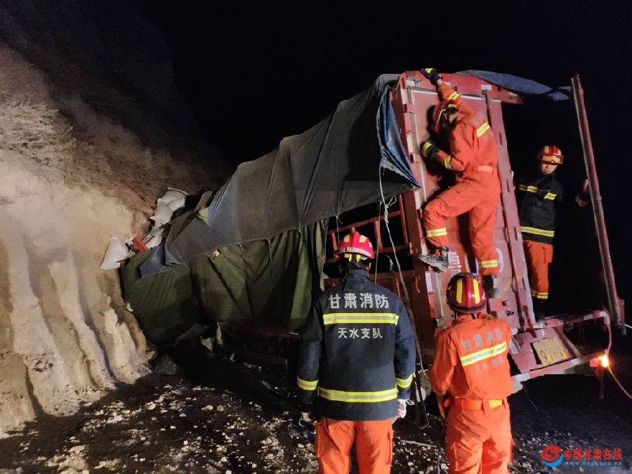 12月13日凌晨00时30分,武山中队接到群众报警:位于武山县城关镇河沟村路段发生车祸,一大货车司机受伤严重,被困驾驶室内,请速救援。武山中队立即出动2辆消防车,10名消防官兵赶赴现场处置。