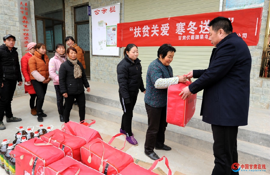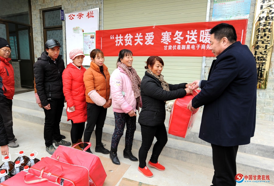 中国甘肃在线天水讯 12月15日,麦积区伏羲御果电子商务有限公司工作人员走进马跑泉镇王家沽沱村,为该村15户精准扶贫户送去棉被、大米和食用油,让寒冬里的贫困户感受到了社会大家庭和爱心企业的温暖。