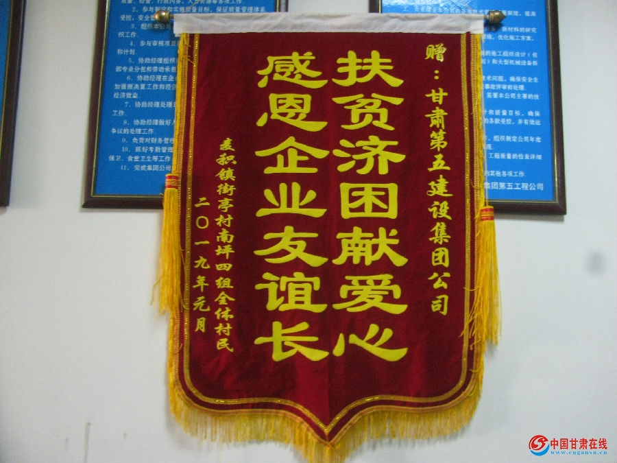 1月25日下午,麦积区麦积镇街亭村党支部副书记带领南坪自然村李随兴一行将一面“扶贫济困献爱心,感恩企业友谊长”的锦旗送到了第五工程公司。