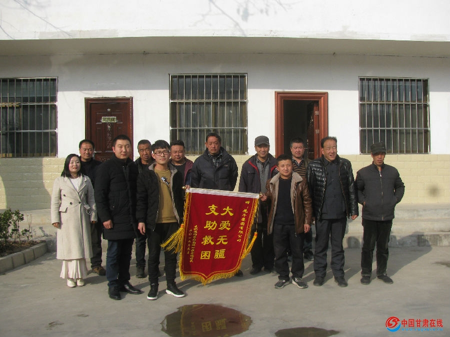 1月28日,麦积镇街亭村南坪自然村在村党支部李随兴的带领下将一面“大爱无疆,支助救困”的锦旗送给天水花牛集团公司。