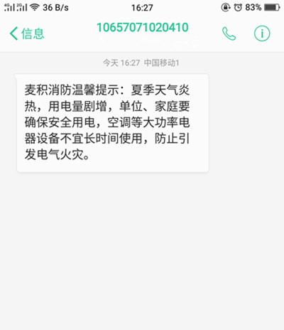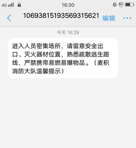 大队充分借助手机网络覆盖面广,宣传高效、快捷的优势,将通俗易懂,贴近生活、贴近实际的防火、灭火等消防安全知识,以手机短信的形式发送至手机用户,将消防安全宣传工作延伸到社会每一个角落。麦积消防温馨提示:进入人员密集场所,请留意安全出口、灭火器材位置,熟悉疏散逃生路线,严禁携带易燃易爆物品;夏季天气炎热,用电量剧增,单位、家庭要确保安全用电,空调等大功率电器设备不宜长时间使用,防止引发电气火灾。