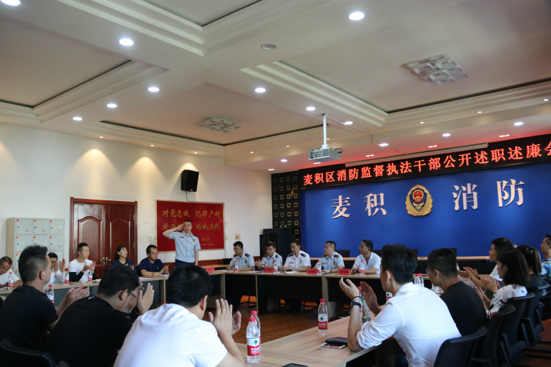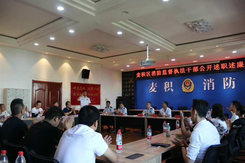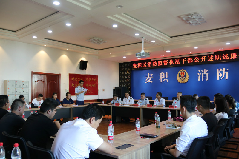 为进一步加强消防监督执法领域廉政建设,有效防止消防监督执法违纪违法问题的发生,提升消防执法公信力和人民满意率,树立消防监督执法队伍良好的社会形象,极力创建人民满意的消防队伍。8月12日下午,麦积大队组织消防监督执法干部面向社会单位公开述职述廉,会议邀请市消防支队防火监督处处长翟建斌同志、市消防支队纪委成员张晓斌同志、麦积区应急管理局副局长裴国栋同志、消防廉政监督员、区消防安全重点单位有关领导以及建设工程建筑、施工、检测单位、辖区街道社区代表共计30余人,大队全体干部参加,会议由政治教导员任海洋通知主持。