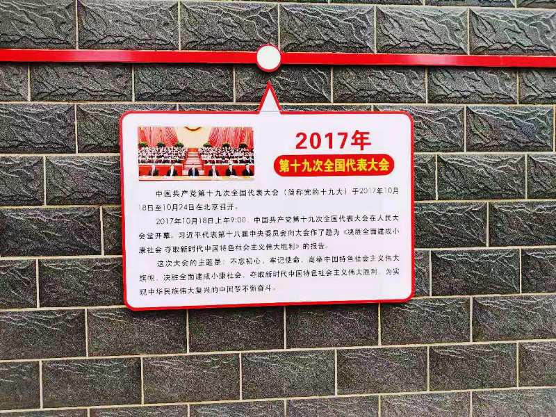 文化墙记述了从1921年中国共产党的成立到2017年十九大的顺利召开。其中主要内容有南昌起义、红军长征、遵义会议、新中国成立、改革开放、十八大以及历任国家领导人提出的指导思想等内容。文化墙俨然已经成为营区一道独特的风景线,一幅幅展板把中国共产党从诞生到一步步茁壮成长再到发展壮大的辉煌历程淋漓尽致的展现出来,不仅美化了营区环境,营造了浓厚的文化氛围,而且强化了全体队员缅怀先烈、铭记历史,树立理想,立志报国的坚定信念,进而也增强了消防救援队伍的使命感与职责感 。