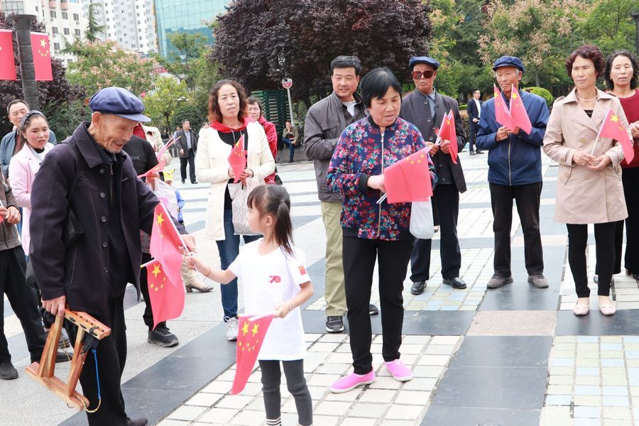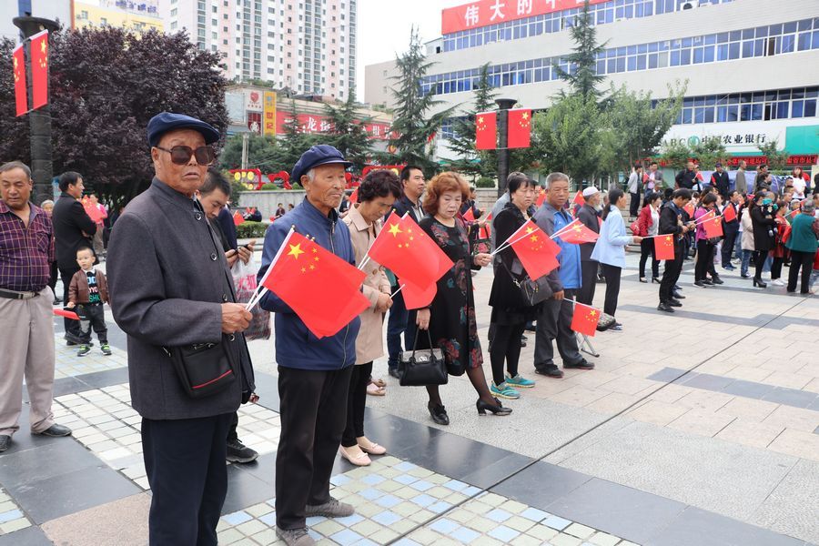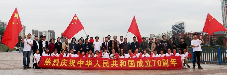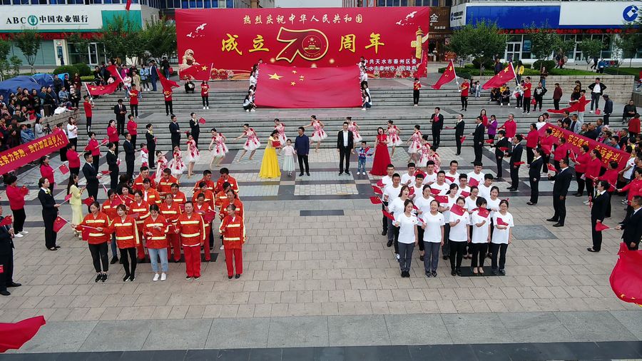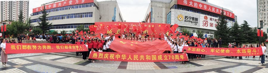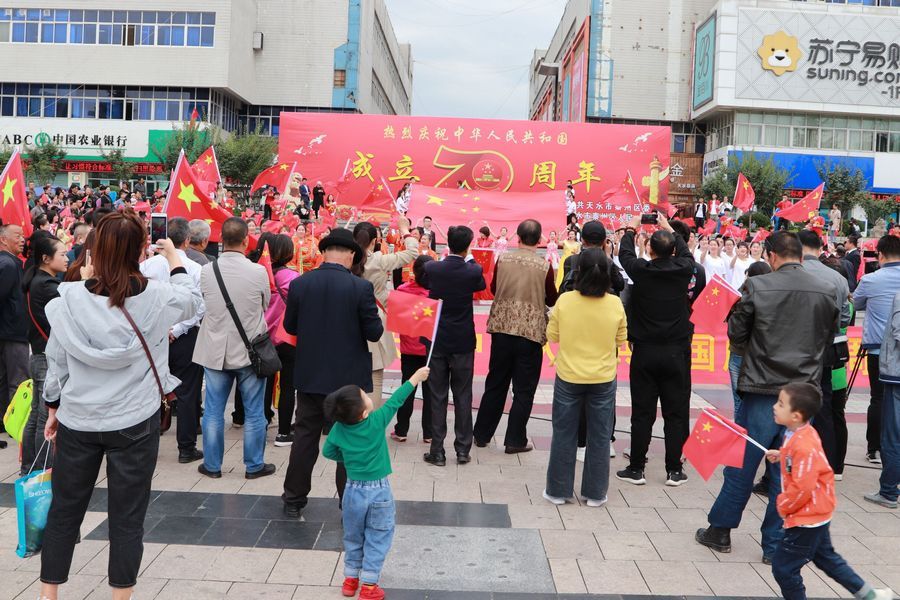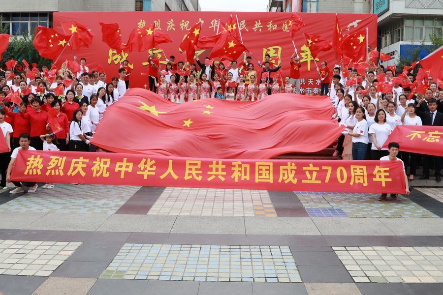 9月19日中午2时许,天水龙城广场早已人山人海,不少人身着节日的盛装,这里既有面目沧桑的老人、也有目光纯真的孩童、还有青春洋溢的青年人……众人将硕大的国旗紧紧围绕在人群中心,拉开写着“热烈庆祝中国人民共和国成立70周年”“不忘初心,牢记使命、永远奋斗”“我们都在努力奔跑,我们都是追梦人”的横幅,齐唱高唱《歌唱祖国》《我和我的祖国》,大家歌声嘹亮,激情澎湃,现场气氛热烈而感人。最后,大家齐声呐喊:“我爱你,祖国!”挥舞着国旗,表达了对祖国母亲的深情祝福。