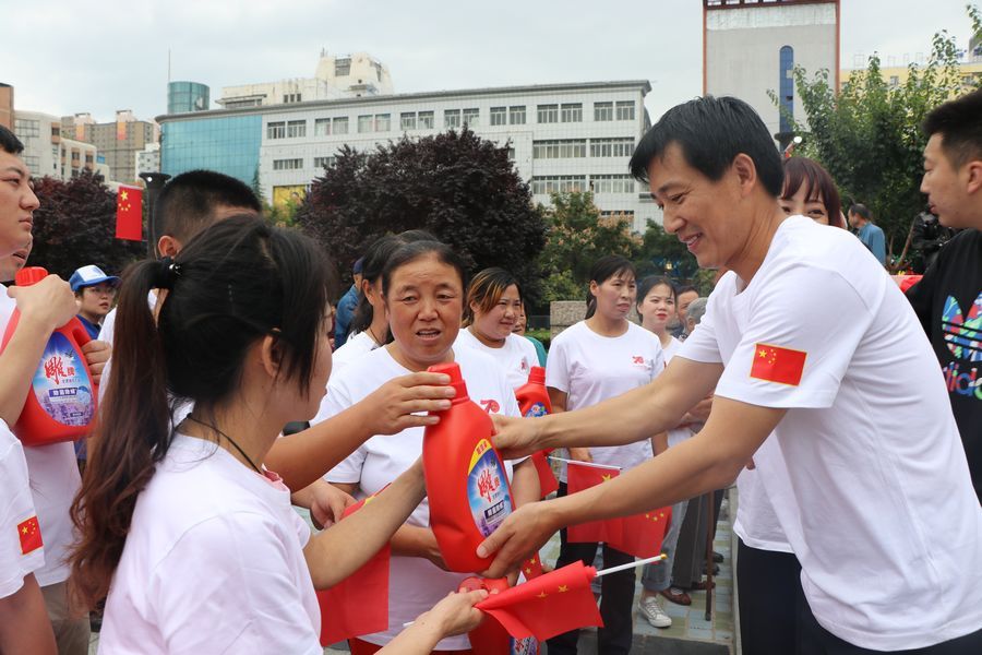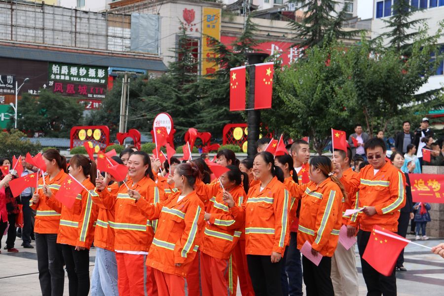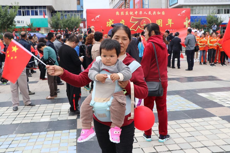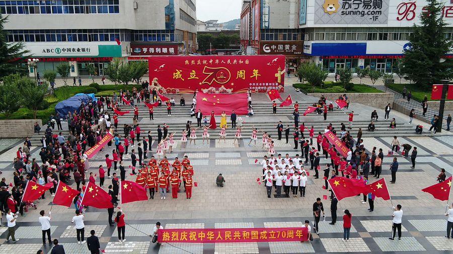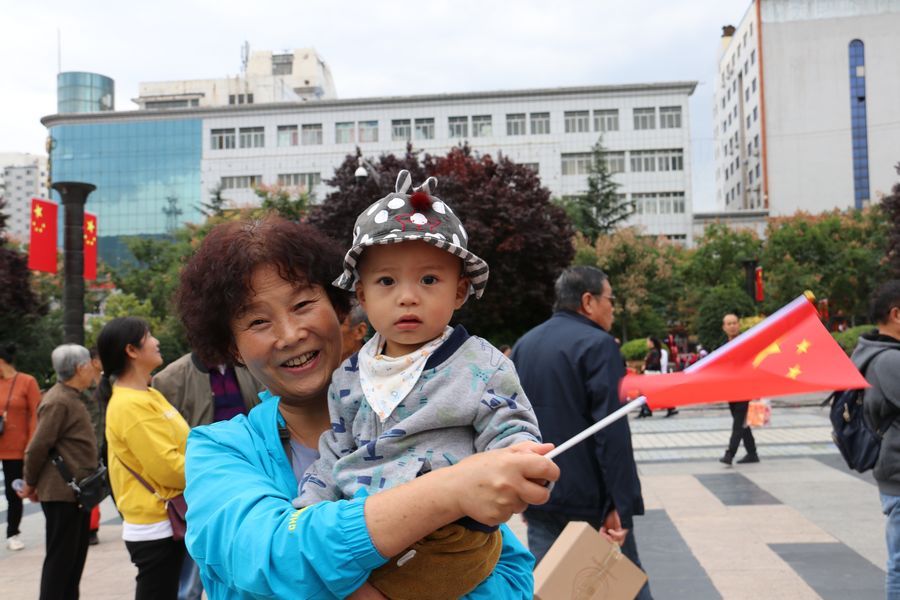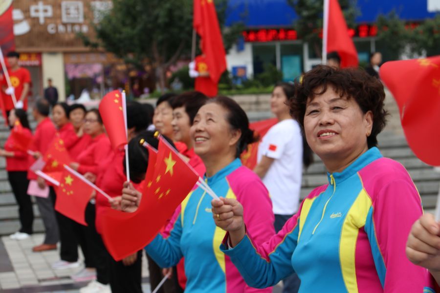 9月19日中午2时许,天水龙城广场早已人山人海,不少人身着节日的盛装,这里既有面目沧桑的老人、也有目光纯真的孩童、还有青春洋溢的青年人……众人将硕大的国旗紧紧围绕在人群中心,拉开写着“热烈庆祝中国人民共和国成立70周年”“不忘初心,牢记使命、永远奋斗”“我们都在努力奔跑,我们都是追梦人”的横幅,齐唱高唱《歌唱祖国》《我和我的祖国》,大家歌声嘹亮,激情澎湃,现场气氛热烈而感人。最后,大家齐声呐喊:“我爱你,祖国!”挥舞着国旗,表达了对祖国母亲的深情祝福。