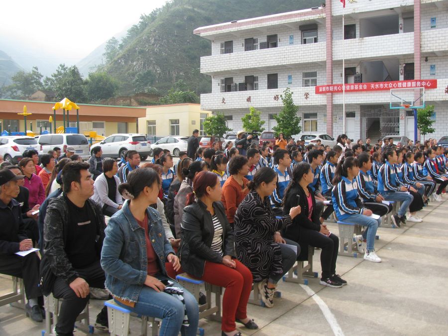 深圳市阳光心理健康基金会理事长孟黎明、天水市工商联、麦积区花牛中心学校、天水市大众心理健康服务中心负责人、30名志愿者及全校师生100多人参加了活动。该项目是深圳市阳光基金会和天水市大众心理健康服务中心联合把“暖心甘肃留守儿童”心理健康帮扶的好项目落地在花牛镇白家河学校。