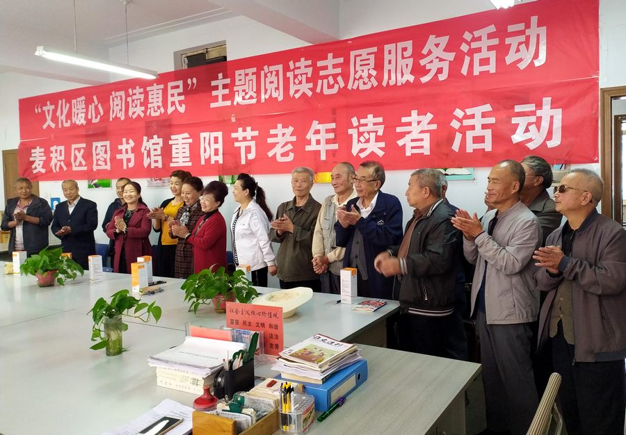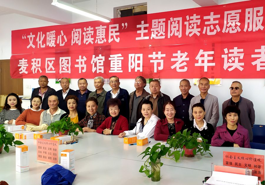 为弘扬中华民族尊老、敬老的传统美德,在重阳节即将来临之际,麦积区图书馆举行重阳节老年读者活动,活动通过召开老年读者座谈会、才艺表演和全体合唱《我和我的祖国》等形式,老年读者欢聚一堂,共话麦积区图书馆发展、同庆重阳佳节。