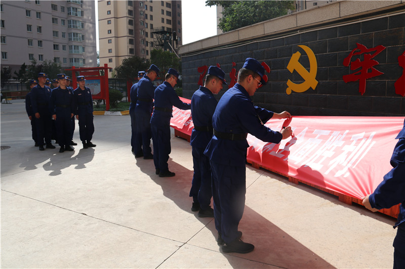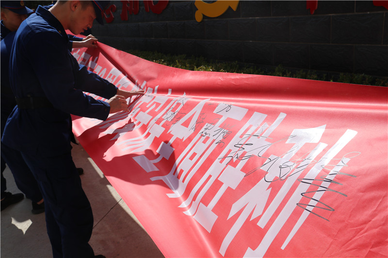 首战用我,用我必胜。铮铮誓言,豪情满怀,以更加昂扬的斗志、更加饱满的精神、更加过硬的作风,决战决胜国庆70周年消防安保攻坚战。全体指战员在印有“履行新使命、忠诚保平安、誓夺国庆70周年消防安保全面胜利”的条幅上踊跃签名,表达坚决打赢这场硬仗的信心和决心。