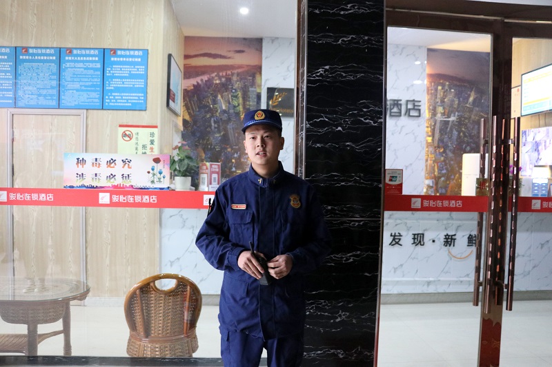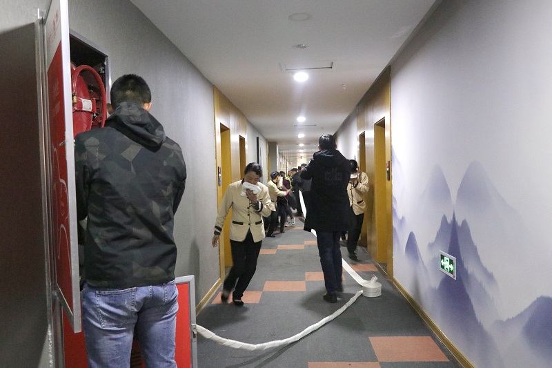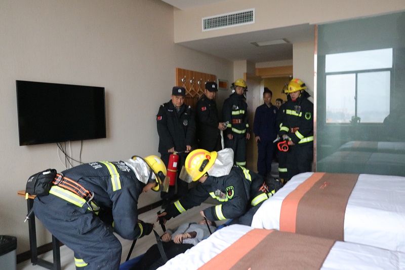 演练假设该市场一酒店四楼410房间发生火灾,酒店保安部通过监控发现火情后,迅速组织疏散店内人员,并拨打119报警求助。消防大队接到报警后,立即出动2辆消防车、10名消防指战员赶赴现场。到达现场后,指挥员立即下达作战指令:侦查组对火势进行侦查;灭火组直击火点,对火势进行扑灭;搜救组在水枪掩护下,对楼层内进行搜索。经过5分钟的搜救,被困人员被成功救出。20分钟后,“大火”被成功扑灭。