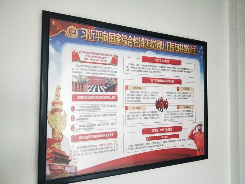 营区文化建设是队伍正规化建设的一项重要内容,是新常态下开展指战员思想政治工作的重要抓手,也是思想政治建设的重要组成部分。此次宣传文化长廊的更换制作,大队领导力求把展板做细做精。结合自身实际,专门搜集资料和图片。重点在注重实效、信息更新、丰富形式、资源整合上下功夫,力求把长廊做成精品力作。新的文化长廊内容丰富,形式多样,主要以习总书记训词、灭火救援、实战演练、业务训练、拥政爱民以及部队管理等多种题材图片和文字方面入手,具有强烈的艺术性和纪实性,充分展现出了严格的队伍管理、和谐的文化氛围。一目了然的宣传字画,让指战员利用训练、工作间隙尽情浏览,认真学习习总书记训词精神和“对党忠诚、纪律严明,赴汤蹈火,竭诚为民”四句话总要求,进一步促进了队伍训词精神对队伍的熏陶;从而有力地促进指战员素质的提高,激励指战员的工作热情,为指战员思想素质升华提供了一个有力的平台。