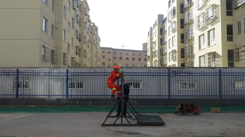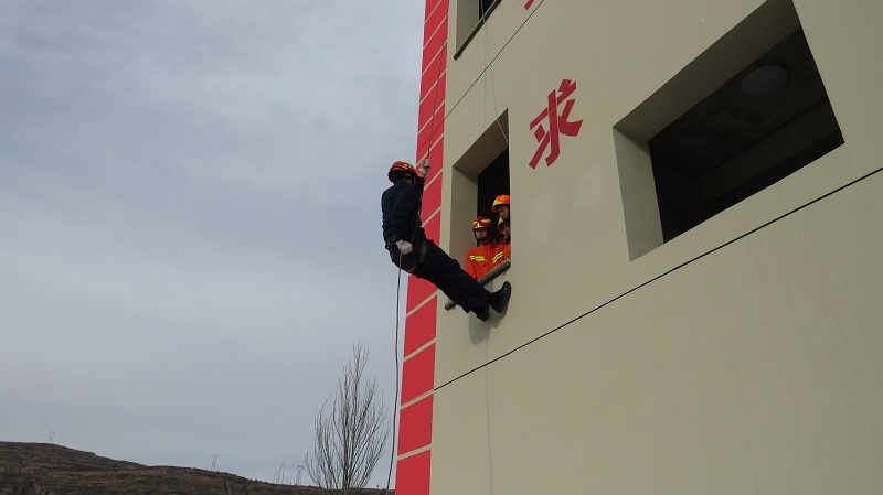 训练前,带训骨干组织全体队员进行了充分的热身准备,防止在训练过程中出现拉伤、扭伤等训练事故的发生。从增强指战员体能素质入手,合理安排训练内容,制定有针对性的训练计划,先后组织全体消防员进行了15米拉梯、绳索攀爬、楼层火灾内攻操等业务技能训练。