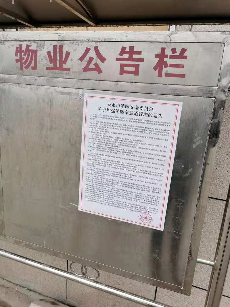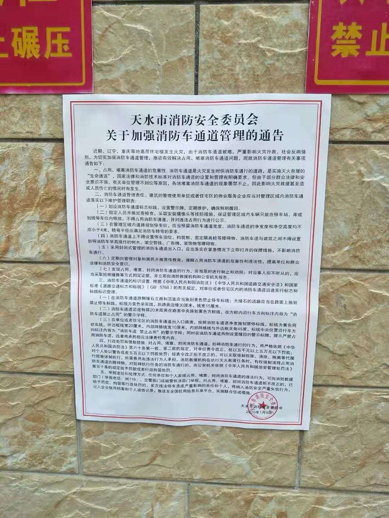 为深入推进打通“生命通道”集中治理行动,加强消防车通道管理,有效解决占用、堵塞消防车通道等火灾隐患问题。连日来,大队深入辖区各居民小区广泛张贴“天水市消防安全委员会关于加强消防车通道管理的通告”,进一步提高广大人民群众的消防安全意识,着力解决居民小区消防车通道被堵塞、占用等突出问题。