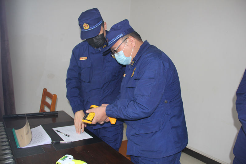 期间,代处长王俭详细了解了大队落实出入营门登记和体温监测制度,详细询问了过年期间轮休人员身体健康状况,及实地查看隔离区域防护措施,确保安全稳定。仔细查看食堂物资储存情况,对疫情防控物资储备情况进行了详细查看。随后,代处长王俭传达学习了三级党委扩大会议精神,并查看支部会议记录。