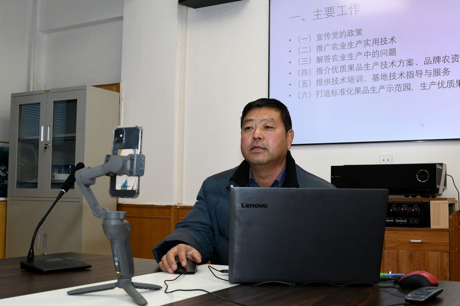 麦积区农业农村局高级农艺师裴宏州应邀在“三农技术服务直播间”做首场讲座,充分利用幻灯片、小视屏、图片等多种形式,将春季果树修剪、拉枝整形、嫁接栽培、清园施肥、病虫害防治等方面做了深入浅出的讲解,并依靠“千里眼”、“顺风耳”的独特优势对广大果农提出的问题做了一一解答,深受果农朋友喜欢,直播间成了广大农民朋友交流学习的贴心人、脱贫致富的好帮手。
